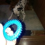 Brya dice que es tan suave para ella… La imagen es después de 1 minuto de reproducción. Este juguete es para perros pequeños o perros sin dientes.